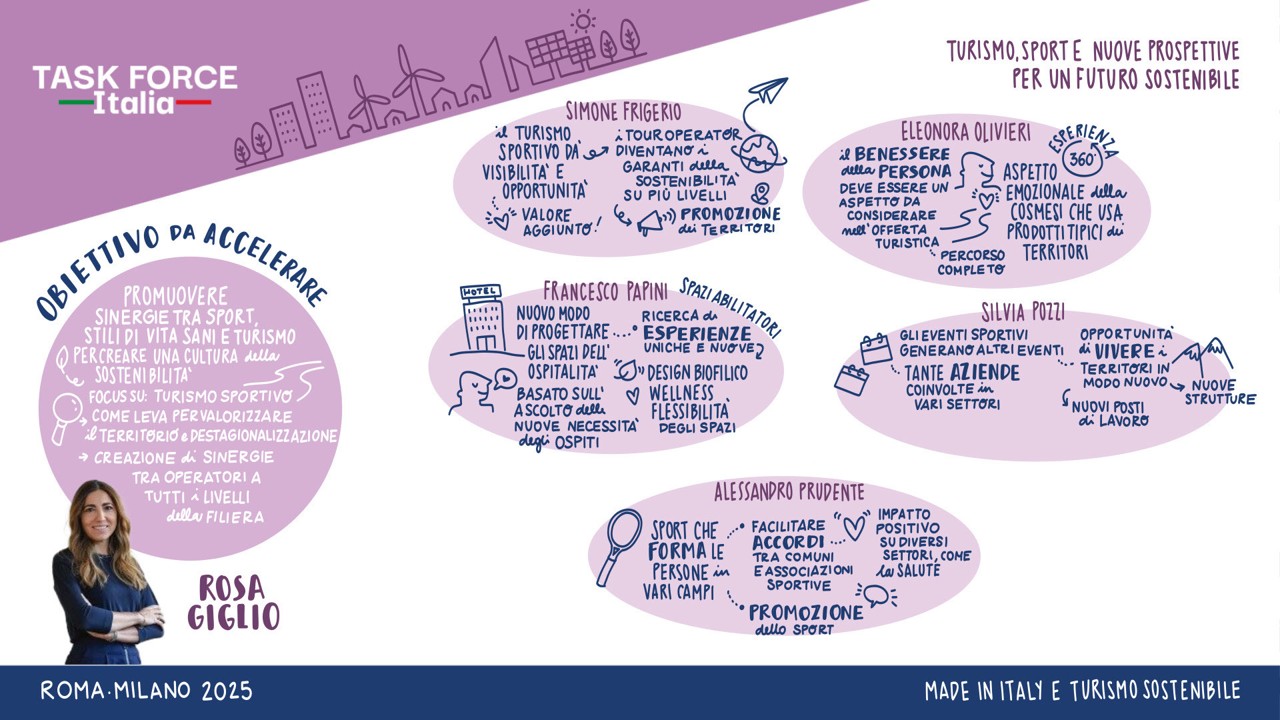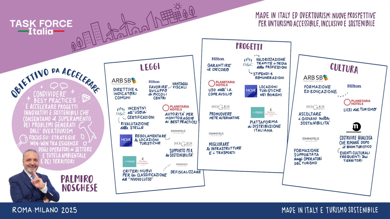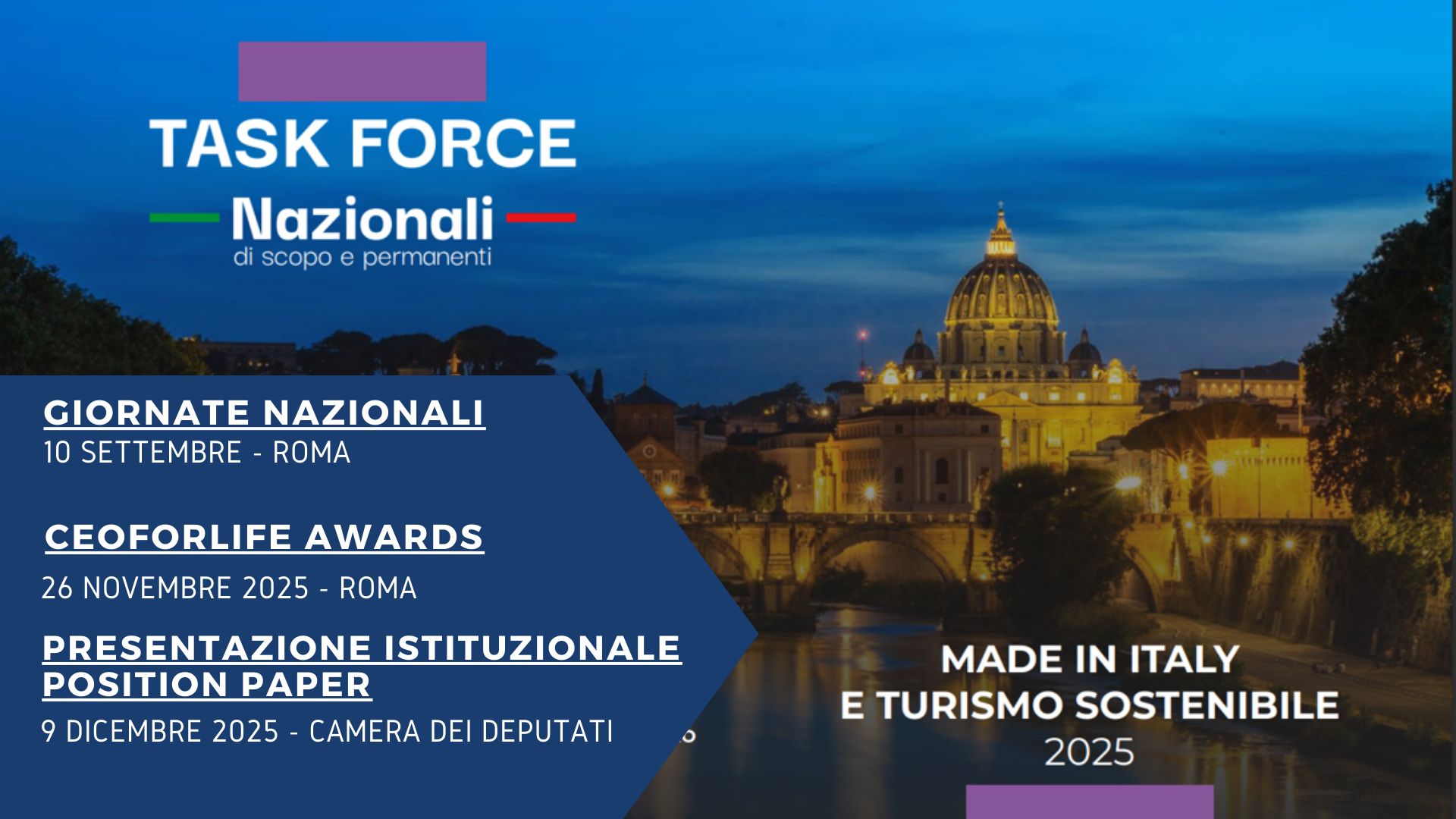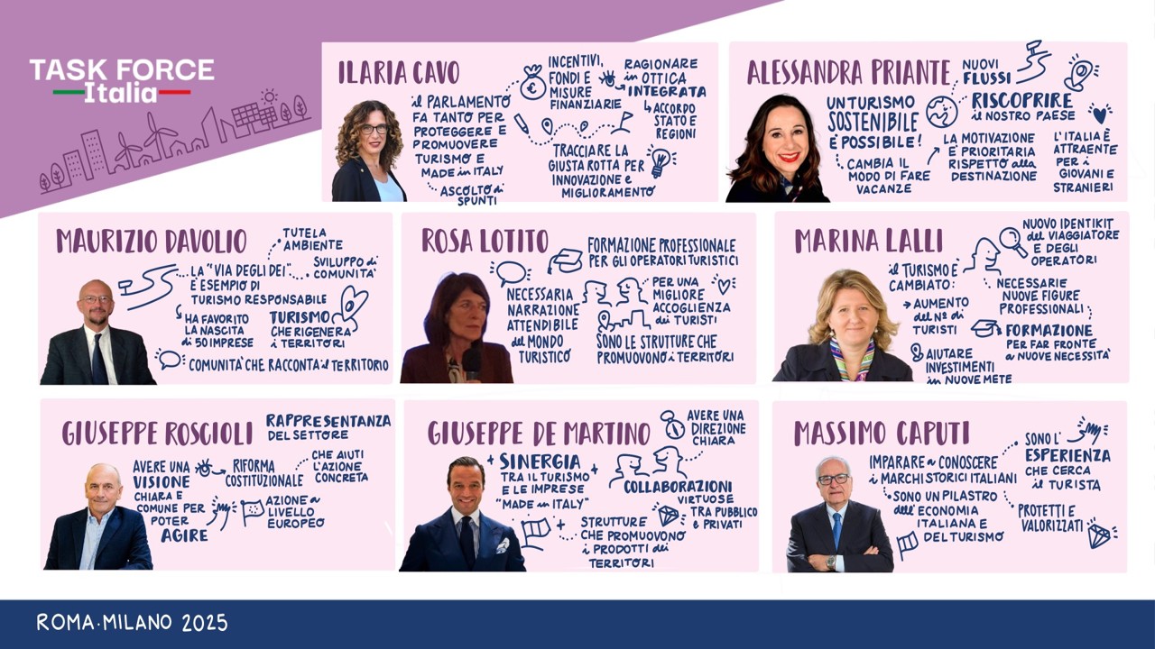 Sen. Gian Marco Centinaio, Vicepresidente del Senato | Giordano Fatali, President & Founder CEOforLIFE - Task Force Italia | Palmiro Noschese, Practice Leader Made in Italy e Turismo Sostenibile, Task Force Italia | On. Ilaria Cavo, Vicepresidente Commissione Attività Produttive, Commercio e Turismo, Camera dei Deputati | Alessandra Priante, Presidente, ENIT Spa | Maurizio Davolio, Presidente, Associazione Italiana Turismo Responsabile | Rosa Lotito, Presidente, Associazione Nazionale Ospitalità Italiana Made in Italy (ANOI) | Marina Lalli, Presidente, Federturismo Confindustria | Giuseppe Roscioli, Vicepresidente Vicario, Federalberghi | Giuseppe De Martino, President Tourism and Leisure Industry, Unindustria | Massimo Caputi, Presidente, Associazione Marchi Storici d’Italia | Rosa Giglio, Head of Brand Marketing & Communication, BWH Hotels Italia & Malta | Daria Braga, Direttore, Fondazione Laureus Italia Ets | Patrizia Cupo, Responsabile Comunicazione, AiCS | Antonio Ungaro, Responsabile Ufficio Stampa e Comunicazione, FCI – Federazione Ciclistica Italiana | Maurizio Davolio, Presidente, AITR | Stefano Fiori, Vicepresidente, Federturismo/Confindustria, Membro del CDA, Convention Bureau di Roma e Lazio | Simone Frigerio, General Manager, Gruppo Frigerio | Eleonora Olivieri, Commercial Director Italy and Central Europe, GFL Cosmetics | Francesco Papini, Key Account Manager, Il Prisma | Silvia Pozzi, Direttore Operativo, Gruppo Gattinoni | Alessandro Prudente, Presidente, Federterziario Sport | Massimo Fileni, Vicepresidente, Gruppo Fileni | Simone Santini, General Manager, Gruppo Fileni | Giovanni Filippini, Direttore Generale della Sanità Animale, Ministero della Salute | Francesco Camassa, Presidente, AIMA | Davide Bochicchio, Ricercatore, CREA-ZA | Simona Maria Del Treppo, Food Safety, Health and Safety Director, Eataly | Andrea Filippi, Certification Service Line Manager, Bureau Veritas Italia | Enzo Foccoli, Head BU Livestock, Boehringer Ingelheim Animal Health Italia | Bianca Furlotti, Responsabile Settore Alimentare Italia, Compassion in World Farming | Mattia Grillini, Vicepresidente, Responsabile Marketing, Comunicazione e Soci, Camst Group | Silvia Tramontin, Vicedirettore Generale Vicario, Direttore Dipartimento Laboratori di Prova, ACCREDIA | Ada Rosa Balzan, CEO, ARB SB | Paolo Bellè, Cluster General Manager, Hilton Hotels & Resorts | Giorgio Caire di Lauzet, Fondatore e Amministratore Delegato, DREAM&CHARME | Damiano De Crescenzo, Direttore Generale, Planetaria Hotels | François Droulers, Founder and CEO, Move Hotels | Andrea Galardi, Founder & CEO, Soges Group | Giacomo Guzzardi, Cluster General Manager, Le Meridien Visconti Rome and Palazzo Scanderbeg – Rome | Paolo Meroni, School Director, Istituto Marangoni Milano | Lorenzo Nencini, Cluster General Manager, Complex di Roma - Starhotels Metropole & Starhotels Michelangelo