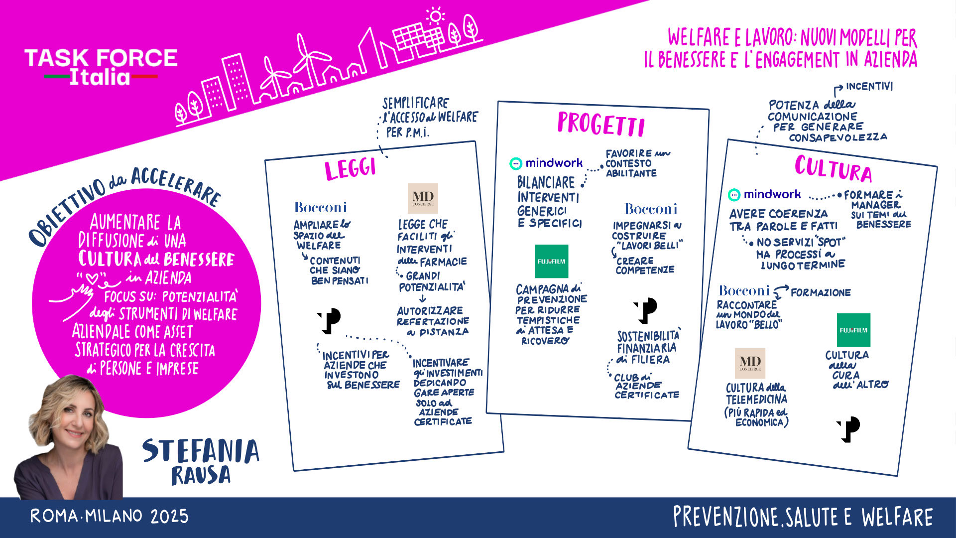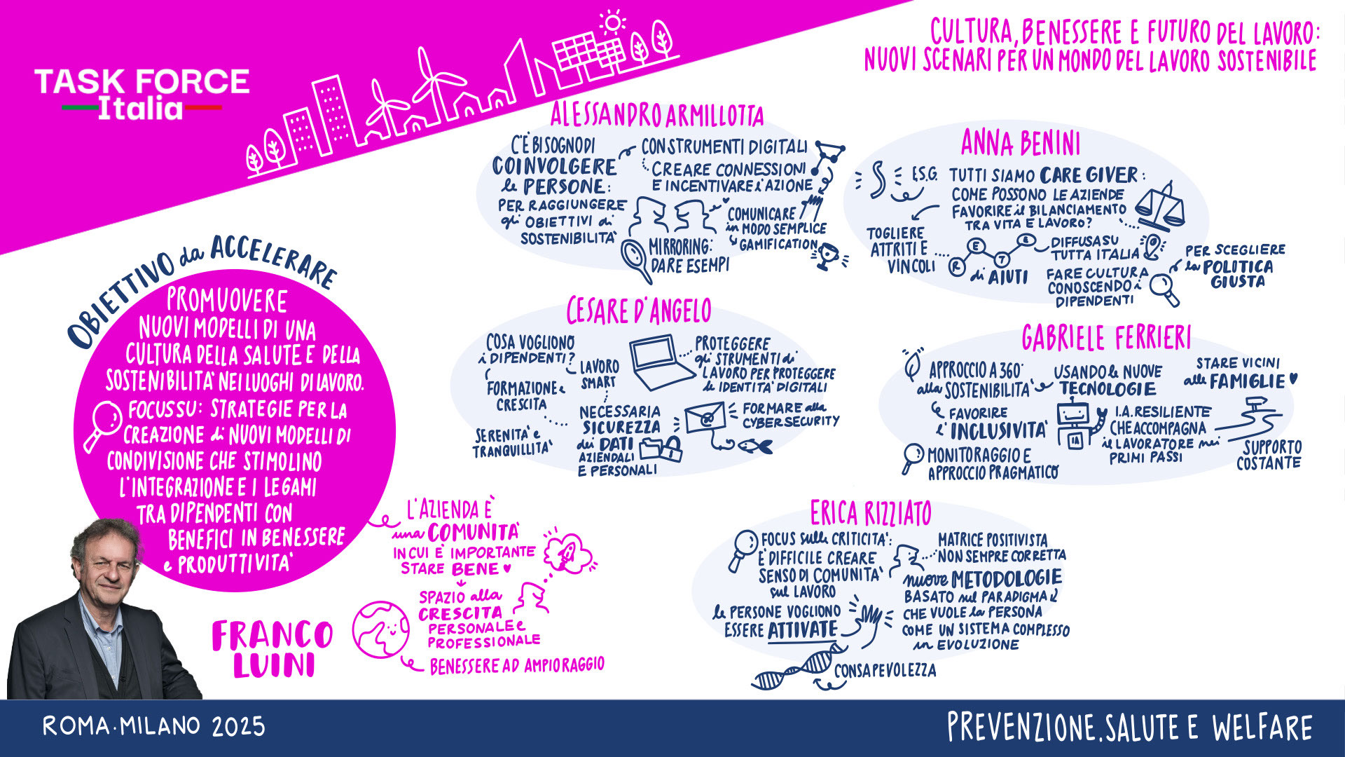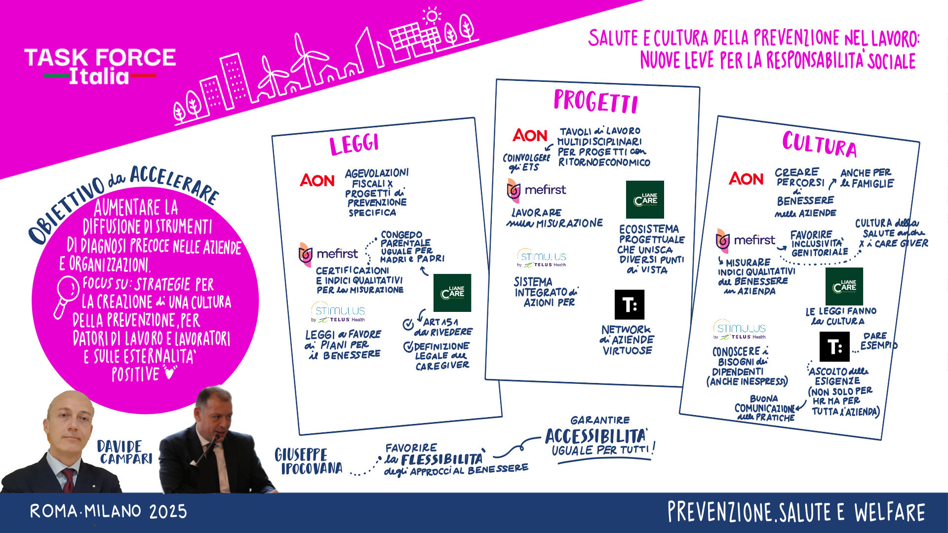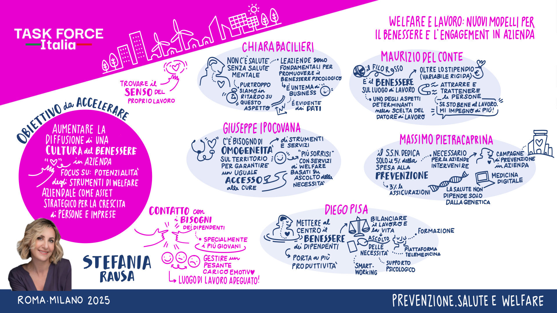Stefano Colasanti, WellMakers Leader, WellMakers by BNP Paribas | Andrea Crisanti, Segretario della Commissione Cultura e Patrimonio Culturale, Istruzione Pubblica del Senato | Barbara De Mei, Direttore del Reparto Sorveglianza dei fattori di rischio e strategie di promozione della salute Centro Nazionale per la Prevenzione delle malattie e la Promozione della Salute (CNaPPS), Istituto Superiore di Sanità (ISS) | Ugo Della Marta, Direttore Generale Igiene e sicurezza alimentare Ministero della Salute | Giordano Fatali, President & Founder, CEOforLIFE - Task Force Italia | Elena Folpini, Managing Director, New Line Ricerche di Mercato | Guido Gastaldon, Responsabile Divisione Sourcing Sanità, Beni e Servizi, CONSIP | Giuseppe Natale, Direttore Generale, Cooperativa Sociale San Bernardo | Ilenia Malavasi, Membro della Commissione Affari Sociali della Camera | Emmanuele Massagli, Presidente, Associazione Italiana Welfare Aziendale (AIWA) | Francesca Moccia, Vicesegretaria generale, Cittadinanzattiva | Emanuele Monti, Presidente Commissione Welfare in Regione Lombardia, membro del Cda di Aifa | Renata Polverini, già Presidente Regione Lazio | Alfredo Procaccini, Vicepresidente Nazionale, Federfarma | Guido Quintino Liris, Membro Commissione Bilancio del Senato | Walter Rizzetto, Presidente della XI Commissione (Lavoro Pubblico e Privato), Camera dei Deputati | Francesco Silvestro, Presidente Commissione Bicamerale per le Questioni Regionali | Monica Stefanelli, Componente della Giunta di Farmindustria | Sandra Zampa, 10a Commissione permanente (Affari sociali, sanità, lavoro pubblico e privato, previdenza sociale) | Ylenia Zambito, 10a Commissione permanente (Affari sociali, sanità, lavoro pubblico e privato, previdenza sociale) | Mario Alessandra, Founder & CEO, Mindwork | Davide Campari, General Manager, Healthcare - Fujifilm Italia | Stefano Carmenati, Amministratore Delegato, Comunità di S. Egidio | Marcello Cattani, Presidente e AD, Sanofi Italia e Malta | Gianluca Cesare, Group Chief Information Officer, Humanitas Research Hospital Group | Claudia Cipolla, Head of Italy, Wellhub | Ottavio Di Cillo, Presidente, AiSDeT - Associazione italiana Sanità digitale e Telemedicina | Eugenio Di Brino, Co-Founder & Partner, Altems Advisory | Fabio De Petris, CEO, BAT Italia | Davide Fanelli, General Manager Southern Europe (Italy, Spain, Portugal) Haleon | Cristian Fabbri, Presidente Esecutivo, Gruppo Hera | Vincenzo Giannattasio Dell’Isola, EVP Regional Managing Director, Dedalus | Mariastella Giorlandino, Presidente, Rete Artemisia Lab | Franco Luini, Owner, Tucano | Giacomo Lorusso, CEO, Jakala Civitas | Giuseppe Navanteri, Responsabile, UOSD Ingegneria Clinica e Tecnologie e Sistemi Informatici IFO | Annamaria Parente, Direttrice Osservatorio sulla Crisi Demografica, Fondazione Magna Carta | Nicola Patrizi, Presidente, Federterziario | Teresa Petrangolini, Direttrice Patient Advocacy Lab, Università Cattolica del Sacro Cuore | Christian Poehlking, CFO & Administration Director, Boehringer Ingelheim | Laura Premoli, General Manager, Grünenthal Italia | Alfredo Procaccini, Vicepresidente Nazionale, Federfarma | Emiliano Rantucci, Amministratore Delegato, Avanade Italy | Fabrizio Ruggiero, CEO & Managing Director, Edenred Italia | Stefano Sardara, CEO, Acrisure | Flavio Sensi, Direttore Generale, ASL Sassari | Gabriele Sepio, Segretario generale dell’Osservatorio per la Filantropia e il Terzo Settore, Fondazione Terzjus | Anna Maria Testa, HR Director Business Unit Digital Trust, InfoCert - Tinexta Group | Alessandro Polidori Vidal, Marketing Director, POLIMI GSoM | Stefano Colasanti, WellMakers by BNP Paribas | Christian Poehlking, CFO & Administration Director, Boehringer Ingelheim | Stefania Rausa, Edenred Italia | Chiara Bacilieri, Mindwork | Davide Campari, Fujifilm Healthcare Italia | Aureliano Cicala, MSC Crociere | Maurizio Del Conte, Università Bocconi | Massimo Pietracaprina, MDConcierge | Diego Pisa, TP Italy Group | Davide Campari, Fujifilm Healthcare Italia | Anna Benini, LianeCare | Andrea Bertoletti, Stimulus | Cristina Di Loreto, Me First® | Luca Franzi, Aon Advisory & Solutions | Debora Mendola, Transcom | Stefano Sardara, Acrisure | Barbara Ambrogioni, Generali Welion | Domenico Lolli, Nokia Italia | Simone Mantero, Knorr-Bremse Rail Systems Italia | Marco Mazzucco, Reale Mutua | Emanuela Vignotti, Acrisure Italia | Danilo Vivarelli, Technesy Holding | Federico Esposti, Ospedale San Raffaele | Renata Polverini, già Presidente Regione Lazio | Leonardo Villani, Responsabile Coordinamento, Osservatorio Nazionale sulla Salute nelle Regioni Italiane | David Mariani, Presidente, Associazione Stili di Vita Sani e Sostenibili | Alfredo Procaccini, Vicepresidente Vicario, Federfarma | Fabio de Petris, Presidente e Amministratore Delegato, BAT Italia | Ilenia Malavasi, Deputata PD, Componente della Commissione XII – Affari sociali | Emanuele Monti, Presidente Commissione Welfare, Regione Lombardia, membro del Cda, Aifa | Alessio Nardini, Direttore generale Direzione generale dei corretti stili di vita e dei rapporti con l'ecosistema, Ministero della Salute | Mario Antonelli, Presidente Nazionale, FIT – Federazione Italiana Tabaccai | Massimo Ciccozzi, Professore Ordinario di epidemiologia, Università Campus Biomedico – Roma | Massimo Iannetta, Responsabile Divisione Sistemi Agroalimentari Sostenibili, ENEA, Consiglio di Presidenza, Cluster AgriFood | Francesco Luongo, Presidente, Heated Community Hub | Emanuele Marconi, Direttore, CREA-Centro di Ricerca per gli Alimenti e la Nutrizione | David Mariani, Presidente, AssoSVS | Alessandro Camilleri, Direttore Centrale Personale e Organizzazione, Gruppo Hera | Stefano Giordani, Direttore Scientifico, Associazione Onconauti | Claudia Georgia Banella, direttrice generale, KARL STORZ Endoscopia Italia | Daria Braga, Direttrice, Fondazione Laureus Italia ETS | Biancamaria Cavallini, Board Member & Scientific Director, Mindwo