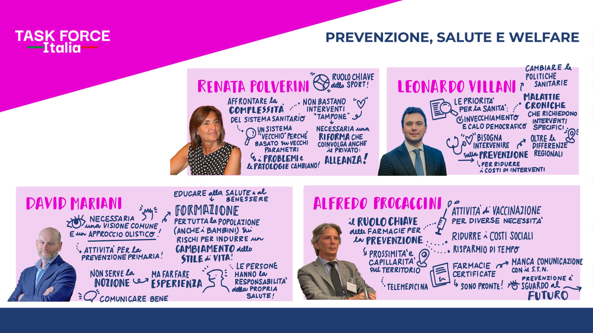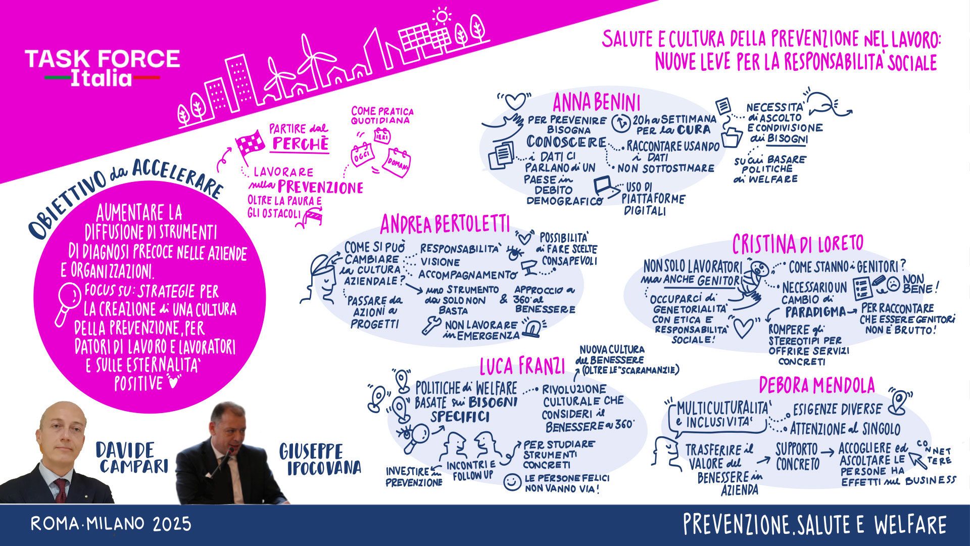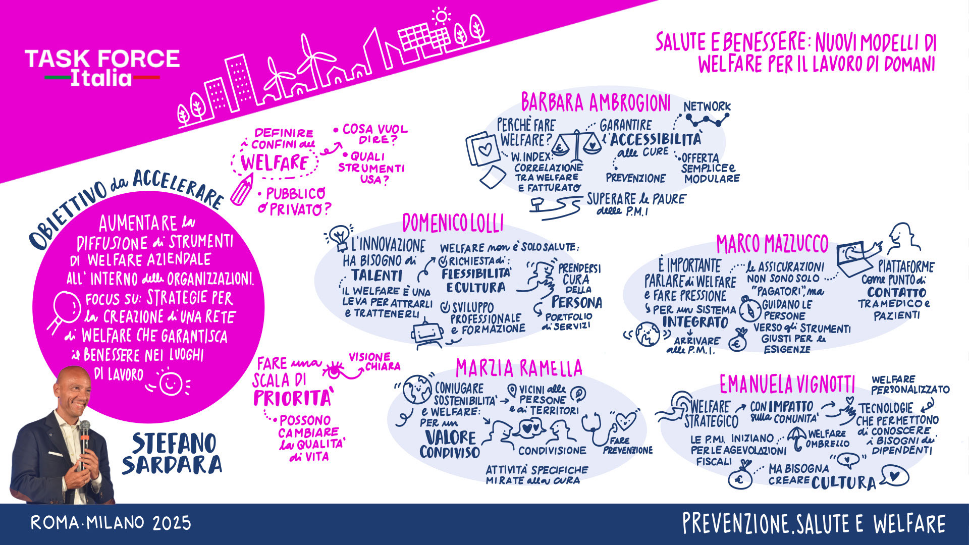 Stefano Colasanti, WellMakers Leader, WellMakers by BNP Paribas | Andrea Crisanti, Segretario della Commissione Cultura e Patrimonio Culturale, Istruzione Pubblica del Senato | Barbara De Mei, Direttore del Reparto Sorveglianza dei fattori di rischio e strategie di promozione della salute Centro Nazionale per la Prevenzione delle malattie e la Promozione della Salute (CNaPPS), Istituto Superiore di Sanità (ISS) | Ugo Della Marta, Direttore Generale Igiene e sicurezza alimentare Ministero della Salute | Giordano Fatali, President & Founder, CEOforLIFE - Task Force Italia | Elena Folpini, Managing Director, New Line Ricerche di Mercato | Guido Gastaldon, Responsabile Divisione Sourcing Sanità, Beni e Servizi, CONSIP | Giuseppe Natale, Direttore Generale, Cooperativa Sociale San Bernardo | Ilenia Malavasi, Membro della Commissione Affari Sociali della Camera | Emmanuele Massagli, Presidente, Associazione Italiana Welfare Aziendale (AIWA) | Francesca Moccia, Vicesegretaria generale, Cittadinanzattiva | Emanuele Monti, Presidente Commissione Welfare in Regione Lombardia, membro del Cda di Aifa | Renata Polverini, già Presidente Regione Lazio | Alfredo Procaccini, Vicepresidente Nazionale, Federfarma | Guido Quintino Liris, Membro Commissione Bilancio del Senato | Walter Rizzetto, Presidente della XI Commissione (Lavoro Pubblico e Privato), Camera dei Deputati | Francesco Silvestro, Presidente Commissione Bicamerale per le Questioni Regionali | Monica Stefanelli, Componente della Giunta di Farmindustria | Sandra Zampa, 10a Commissione permanente (Affari sociali, sanità, lavoro pubblico e privato, previdenza sociale) | Ylenia Zambito, 10a Commissione permanente (Affari sociali, sanità, lavoro pubblico e privato, previdenza sociale) | Mario Alessandra, Founder & CEO, Mindwork | Davide Campari, General Manager, Healthcare - Fujifilm Italia | Stefano Carmenati, Amministratore Delegato, Comunità di S. Egidio | Marcello Cattani, Presidente e AD, Sanofi Italia e Malta | Gianluca Cesare, Group Chief Information Officer, Humanitas Research Hospital Group | Claudia Cipolla, Head of Italy, Wellhub | Ottavio Di Cillo, Presidente, AiSDeT - Associazione italiana Sanità digitale e Telemedicina | Eugenio Di Brino, Co-Founder & Partner, Altems Advisory | Fabio De Petris, CEO, BAT Italia | Davide Fanelli, General Manager Southern Europe (Italy, Spain, Portugal) Haleon | Cristian Fabbri, Presidente Esecutivo, Gruppo Hera | Vincenzo Giannattasio Dell’Isola, EVP Regional Managing Director, Dedalus | Mariastella Giorlandino, Presidente, Rete Artemisia Lab | Franco Luini, Owner, Tucano | Giacomo Lorusso, CEO, Jakala Civitas | Giuseppe Navanteri, Responsabile, UOSD Ingegneria Clinica e Tecnologie e Sistemi Informatici IFO | Annamaria Parente, Direttrice Osservatorio sulla Crisi Demografica, Fondazione Magna Carta | Nicola Patrizi, Presidente, Federterziario | Teresa Petrangolini, Direttrice Patient Advocacy Lab, Università Cattolica del Sacro Cuore | Christian Poehlking, CFO & Administration Director, Boehringer Ingelheim | Laura Premoli, General Manager, Grünenthal Italia | Alfredo Procaccini, Vicepresidente Nazionale, Federfarma | Emiliano Rantucci, Amministratore Delegato, Avanade Italy | Fabrizio Ruggiero, CEO & Managing Director, Edenred Italia | Stefano Sardara, CEO, Acrisure | Flavio Sensi, Direttore Generale, ASL Sassari | Gabriele Sepio, Segretario generale dell’Osservatorio per la Filantropia e il Terzo Settore, Fondazione Terzjus | Anna Maria Testa, HR Director Business Unit Digital Trust, InfoCert - Tinexta Group | Alessandro Polidori Vidal, Marketing Director, POLIMI GSoM | Stefano Colasanti, WellMakers by BNP Paribas | Christian Poehlking, CFO & Administration Director, Boehringer Ingelheim | Stefania Rausa, Edenred Italia | Chiara Bacilieri, Mindwork | Davide Campari, Fujifilm Healthcare Italia | Aureliano Cicala, MSC Crociere | Maurizio Del Conte, Università Bocconi | Massimo Pietracaprina, MDConcierge | Diego Pisa, TP Italy Group | Davide Campari, Fujifilm Healthcare Italia | Anna Benini, LianeCare | Andrea Bertoletti, Stimulus | Cristina Di Loreto, Me First® | Luca Franzi, Aon Advisory & Solutions | Debora Mendola, Transcom | Stefano Sardara, Acrisure | Barbara Ambrogioni, Generali Welion | Domenico Lolli, Nokia Italia | Simone Mantero, Knorr-Bremse Rail Systems Italia | Marco Mazzucco, Reale Mutua | Emanuela Vignotti, Acrisure Italia | Danilo Vivarelli, Technesy Holding | Federico Esposti, Ospedale San Raffaele | Renata Polverini, già Presidente Regione Lazio | Leonardo Villani, Responsabile Coordinamento, Osservatorio Nazionale sulla Salute nelle Regioni Italiane | David Mariani, Presidente, Associazione Stili di Vita Sani e Sostenibili | Alfredo Procaccini, Vicepresidente Vicario, Federfarma | Fabio de Petris, Presidente e Amministratore Delegato, BAT Italia | Ilenia Malavasi, Deputata PD, Componente della Commissione XII – Affari sociali | Emanuele Monti, Presidente Commissione Welfare, Regione Lombardia, membro del Cda, Aifa | Alessio Nardini, Direttore generale Direzione generale dei corretti stili di vita e dei rapporti con l'ecosistema, Ministero della Salute | Mario Antonelli, Presidente Nazionale, FIT – Federazione Italiana Tabaccai | Massimo Ciccozzi, Professore Ordinario di epidemiologia, Università Campus Biomedico – Roma | Massimo Iannetta, Responsabile Divisione Sistemi Agroalimentari Sostenibili, ENEA, Consiglio di Presidenza, Cluster AgriFood | Francesco Luongo, Presidente, Heated Community Hub | Emanuele Marconi, Direttore, CREA-Centro di Ricerca per gli Alimenti e la Nutrizione | David Mariani, Presidente, AssoSVS | Alessandro Camilleri, Direttore Centrale Personale e Organizzazione, Gruppo Hera | Stefano Giordani, Direttore Scientifico, Associazione Onconauti | Claudia Georgia Banella, direttrice generale, KARL STORZ Endoscopia Italia | Daria Braga, Direttrice, Fondazione Laureus Italia ETS | Biancamaria Cavallini, Board Member & Scientific Director, Mindwo