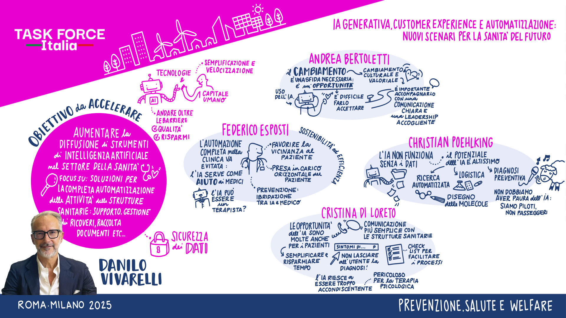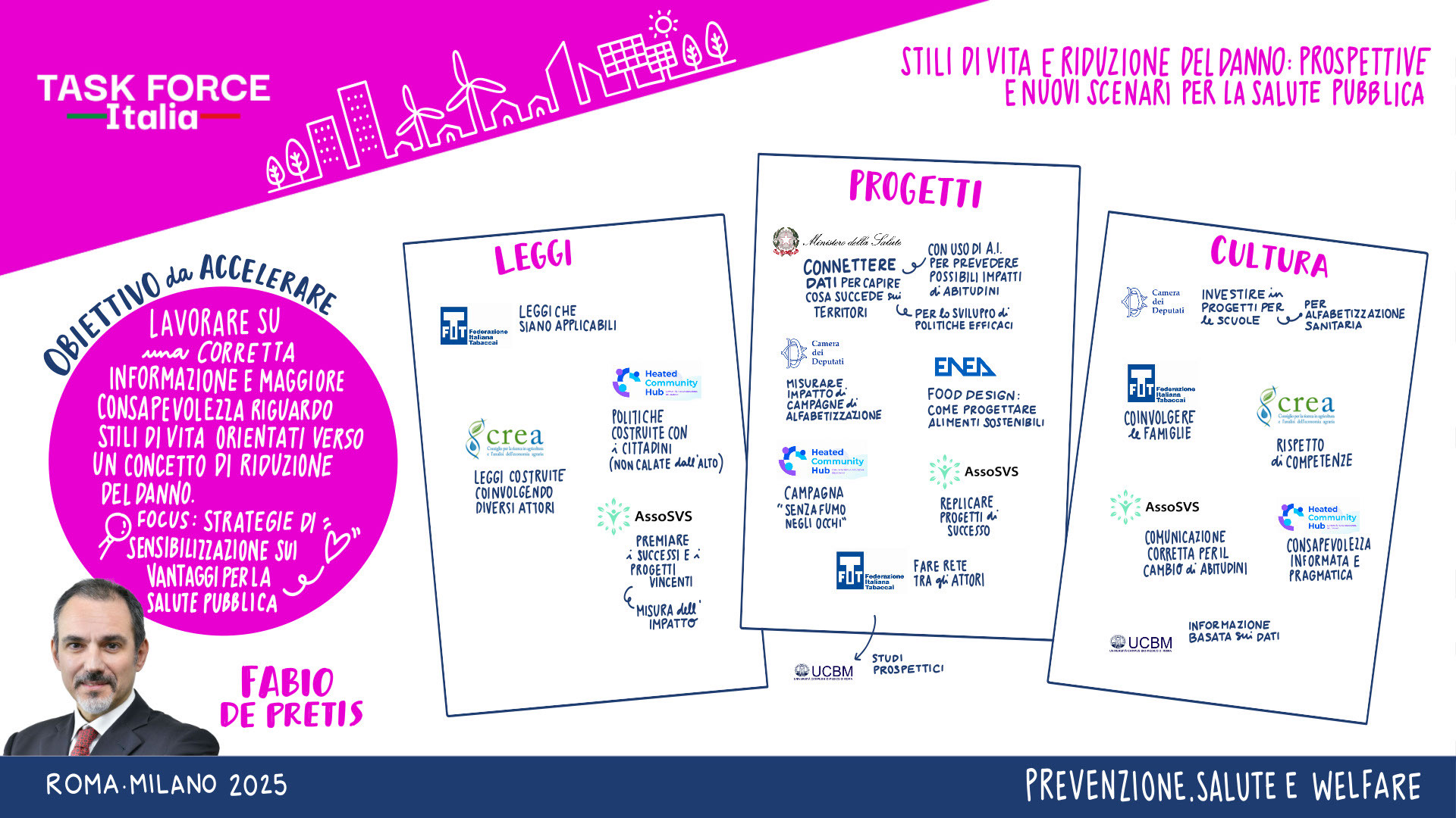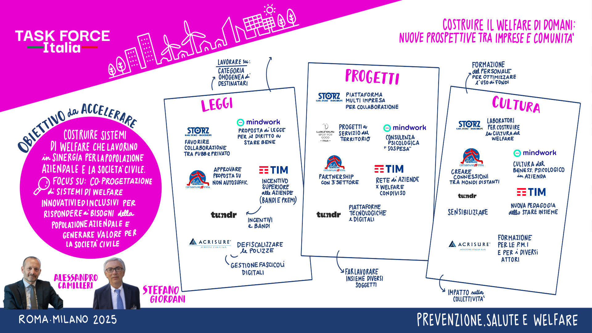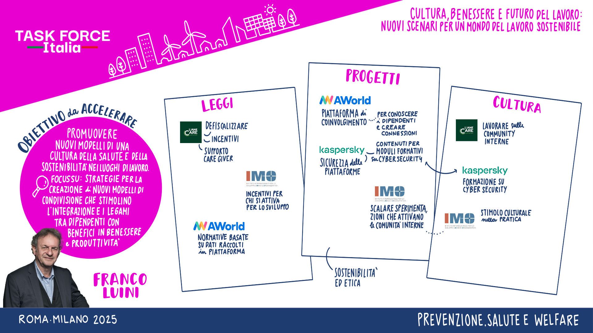 Stefano Colasanti, WellMakers Leader, WellMakers by BNP Paribas | Andrea Crisanti, Segretario della Commissione Cultura e Patrimonio Culturale, Istruzione Pubblica del Senato | Barbara De Mei, Direttore del Reparto Sorveglianza dei fattori di rischio e strategie di promozione della salute Centro Nazionale per la Prevenzione delle malattie e la Promozione della Salute (CNaPPS), Istituto Superiore di Sanità (ISS) | Ugo Della Marta, Direttore Generale Igiene e sicurezza alimentare Ministero della Salute | Giordano Fatali, President & Founder, CEOforLIFE - Task Force Italia | Elena Folpini, Managing Director, New Line Ricerche di Mercato | Guido Gastaldon, Responsabile Divisione Sourcing Sanità, Beni e Servizi, CONSIP | Giuseppe Natale, Direttore Generale, Cooperativa Sociale San Bernardo | Ilenia Malavasi, Membro della Commissione Affari Sociali della Camera | Emmanuele Massagli, Presidente, Associazione Italiana Welfare Aziendale (AIWA) | Francesca Moccia, Vicesegretaria generale, Cittadinanzattiva | Emanuele Monti, Presidente Commissione Welfare in Regione Lombardia, membro del Cda di Aifa | Renata Polverini, già Presidente Regione Lazio | Alfredo Procaccini, Vicepresidente Nazionale, Federfarma | Guido Quintino Liris, Membro Commissione Bilancio del Senato | Walter Rizzetto, Presidente della XI Commissione (Lavoro Pubblico e Privato), Camera dei Deputati | Francesco Silvestro, Presidente Commissione Bicamerale per le Questioni Regionali | Monica Stefanelli, Componente della Giunta di Farmindustria | Sandra Zampa, 10a Commissione permanente (Affari sociali, sanità, lavoro pubblico e privato, previdenza sociale) | Ylenia Zambito, 10a Commissione permanente (Affari sociali, sanità, lavoro pubblico e privato, previdenza sociale) | Mario Alessandra, Founder & CEO, Mindwork | Davide Campari, General Manager, Healthcare - Fujifilm Italia | Stefano Carmenati, Amministratore Delegato, Comunità di S. Egidio | Marcello Cattani, Presidente e AD, Sanofi Italia e Malta | Gianluca Cesare, Group Chief Information Officer, Humanitas Research Hospital Group | Claudia Cipolla, Head of Italy, Wellhub | Ottavio Di Cillo, Presidente, AiSDeT - Associazione italiana Sanità digitale e Telemedicina | Eugenio Di Brino, Co-Founder & Partner, Altems Advisory | Fabio De Petris, CEO, BAT Italia | Davide Fanelli, General Manager Southern Europe (Italy, Spain, Portugal) Haleon | Cristian Fabbri, Presidente Esecutivo, Gruppo Hera | Vincenzo Giannattasio Dell’Isola, EVP Regional Managing Director, Dedalus | Mariastella Giorlandino, Presidente, Rete Artemisia Lab | Franco Luini, Owner, Tucano | Giacomo Lorusso, CEO, Jakala Civitas | Giuseppe Navanteri, Responsabile, UOSD Ingegneria Clinica e Tecnologie e Sistemi Informatici IFO | Annamaria Parente, Direttrice Osservatorio sulla Crisi Demografica, Fondazione Magna Carta | Nicola Patrizi, Presidente, Federterziario | Teresa Petrangolini, Direttrice Patient Advocacy Lab, Università Cattolica del Sacro Cuore | Christian Poehlking, CFO & Administration Director, Boehringer Ingelheim | Laura Premoli, General Manager, Grünenthal Italia | Alfredo Procaccini, Vicepresidente Nazionale, Federfarma | Emiliano Rantucci, Amministratore Delegato, Avanade Italy | Fabrizio Ruggiero, CEO & Managing Director, Edenred Italia | Stefano Sardara, CEO, Acrisure | Flavio Sensi, Direttore Generale, ASL Sassari | Gabriele Sepio, Segretario generale dell’Osservatorio per la Filantropia e il Terzo Settore, Fondazione Terzjus | Anna Maria Testa, HR Director Business Unit Digital Trust, InfoCert - Tinexta Group | Alessandro Polidori Vidal, Marketing Director, POLIMI GSoM | Stefano Colasanti, WellMakers by BNP Paribas | Christian Poehlking, CFO & Administration Director, Boehringer Ingelheim | Stefania Rausa, Edenred Italia | Chiara Bacilieri, Mindwork | Davide Campari, Fujifilm Healthcare Italia | Aureliano Cicala, MSC Crociere | Maurizio Del Conte, Università Bocconi | Massimo Pietracaprina, MDConcierge | Diego Pisa, TP Italy Group | Davide Campari, Fujifilm Healthcare Italia | Anna Benini, LianeCare | Andrea Bertoletti, Stimulus | Cristina Di Loreto, Me First® | Luca Franzi, Aon Advisory & Solutions | Debora Mendola, Transcom | Stefano Sardara, Acrisure | Barbara Ambrogioni, Generali Welion | Domenico Lolli, Nokia Italia | Simone Mantero, Knorr-Bremse Rail Systems Italia | Marco Mazzucco, Reale Mutua | Emanuela Vignotti, Acrisure Italia | Danilo Vivarelli, Technesy Holding | Federico Esposti, Ospedale San Raffaele | Renata Polverini, già Presidente Regione Lazio | Leonardo Villani, Responsabile Coordinamento, Osservatorio Nazionale sulla Salute nelle Regioni Italiane | David Mariani, Presidente, Associazione Stili di Vita Sani e Sostenibili | Alfredo Procaccini, Vicepresidente Vicario, Federfarma | Fabio de Petris, Presidente e Amministratore Delegato, BAT Italia | Ilenia Malavasi, Deputata PD, Componente della Commissione XII – Affari sociali | Emanuele Monti, Presidente Commissione Welfare, Regione Lombardia, membro del Cda, Aifa | Alessio Nardini, Direttore generale Direzione generale dei corretti stili di vita e dei rapporti con l'ecosistema, Ministero della Salute | Mario Antonelli, Presidente Nazionale, FIT – Federazione Italiana Tabaccai | Massimo Ciccozzi, Professore Ordinario di epidemiologia, Università Campus Biomedico – Roma | Massimo Iannetta, Responsabile Divisione Sistemi Agroalimentari Sostenibili, ENEA, Consiglio di Presidenza, Cluster AgriFood | Francesco Luongo, Presidente, Heated Community Hub | Emanuele Marconi, Direttore, CREA-Centro di Ricerca per gli Alimenti e la Nutrizione | David Mariani, Presidente, AssoSVS | Alessandro Camilleri, Direttore Centrale Personale e Organizzazione, Gruppo Hera | Stefano Giordani, Direttore Scientifico, Associazione Onconauti | Claudia Georgia Banella, direttrice generale, KARL STORZ Endoscopia Italia | Daria Braga, Direttrice, Fondazione Laureus Italia ETS | Biancamaria Cavallini, Board Member & Scientific Director, Mindwo