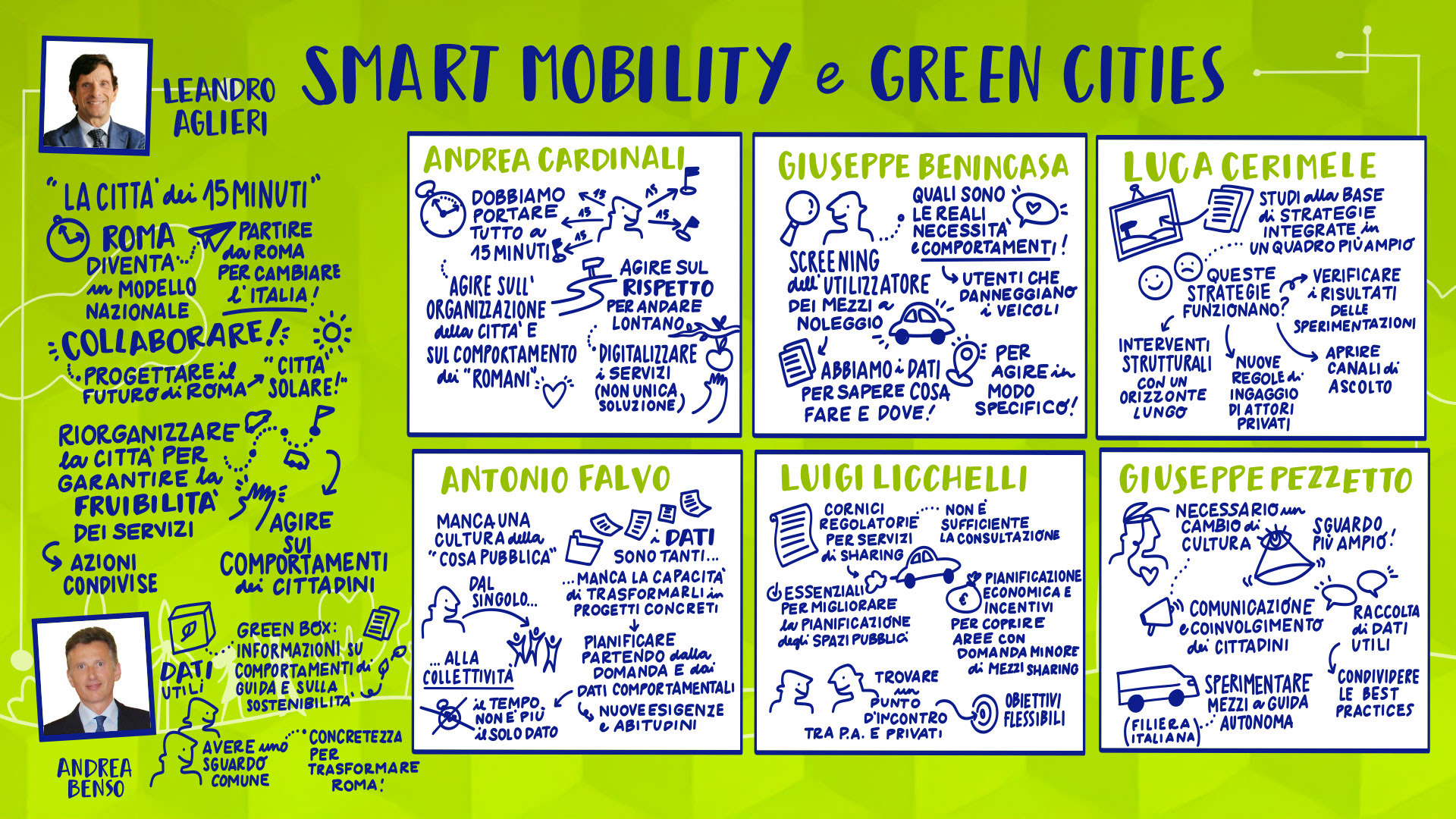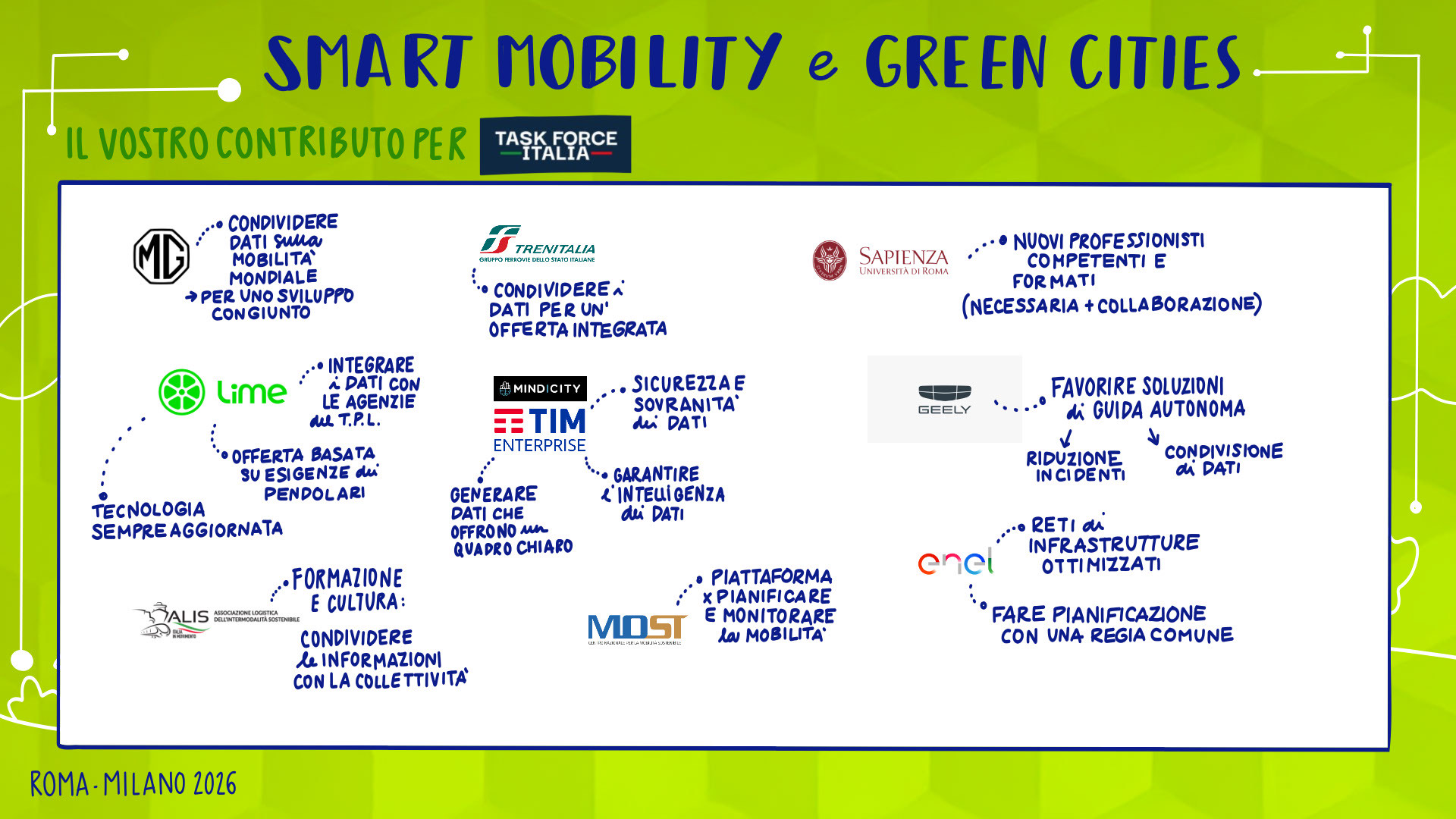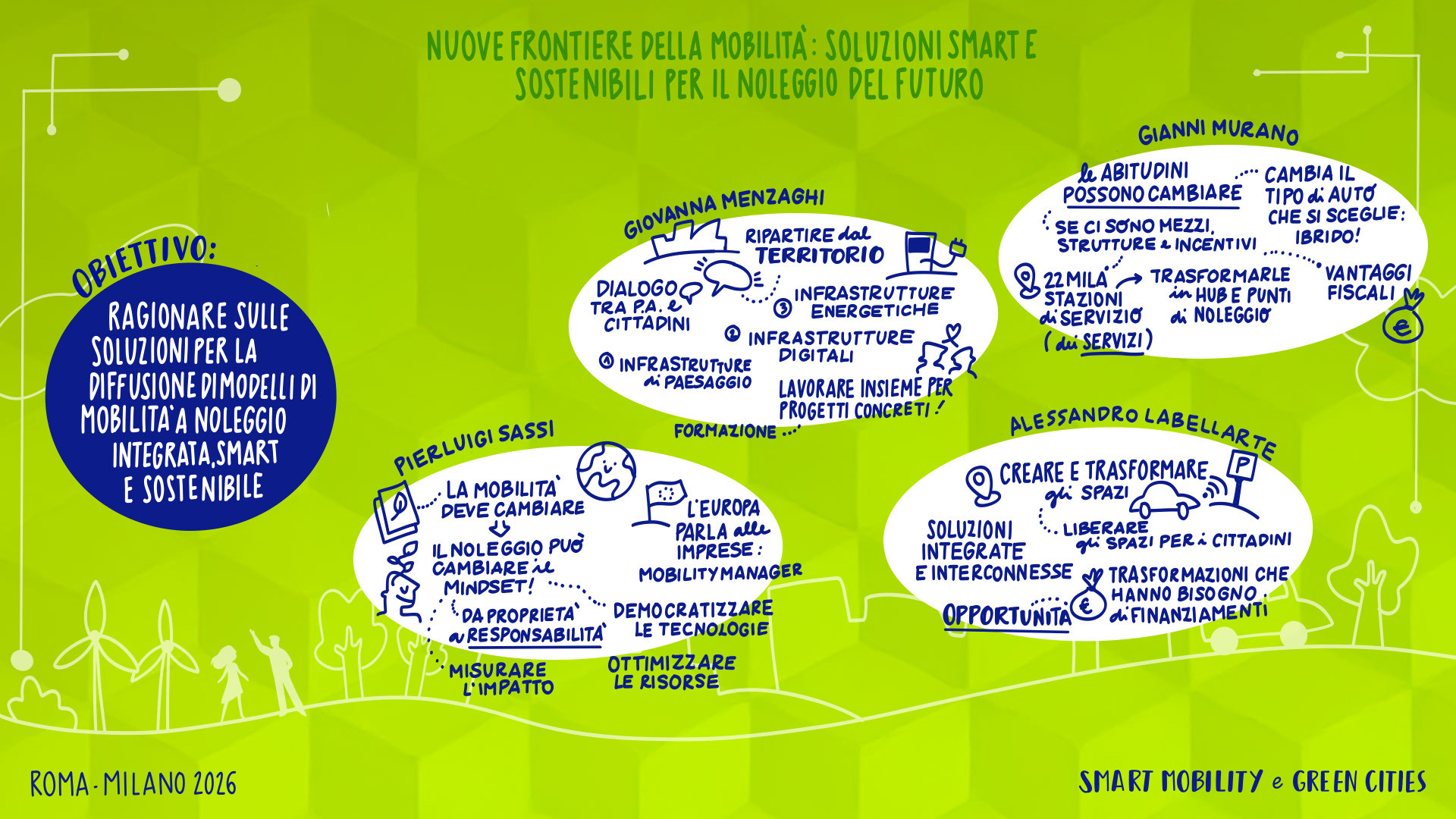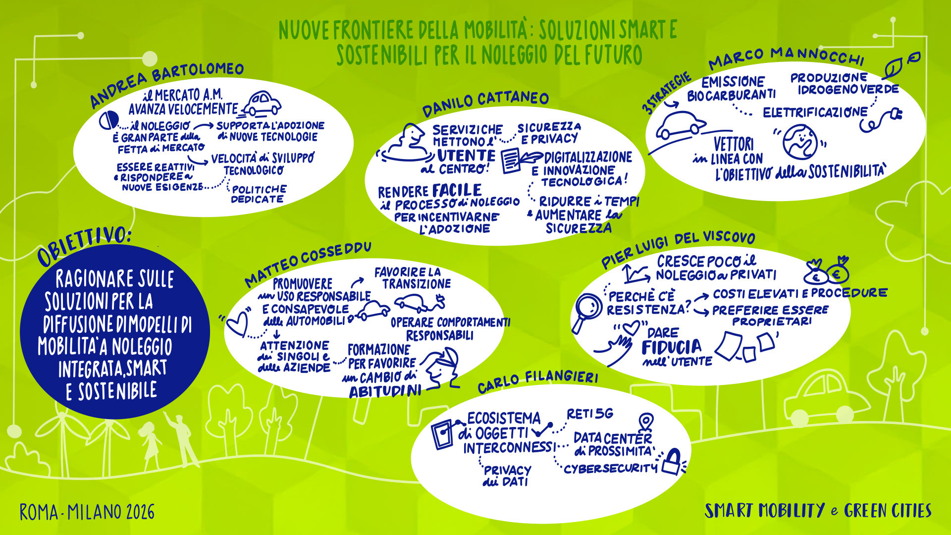 Leandro Aglieri, Presidente, Consulta Roma Smart City Lab | Mario Alovisi, CMO & Revenue Manager, Trenitalia; CEO, Italia Loyalty | Enrico Atanasio, General Manager, DR Automobiles Groupe; Brand Director, EVO | Francesco Baldoni, Direttore Generale per gli Affari Generali e la Digitalizzazione, Ministero delle Infrastrutture e dei Trasporti | Andrea Bartolomeo, Country Manager, MG Motor Italia | Sabina Baruffaldi, Responsabile Anticorruzione, Trasparenza, Compliance e Antiriciclaggio, INVIMIT SGR S.p.A. | Federico Bartolini, Head of Testing and Finishing GT Cars, Ferrari | Matteo Beccuti, CEO, Environment Park | Giuseppe Benincasa, Direttore Generale, ANIASA – Associazione Nazionale Industria dell’Autonoleggio, della Sharing Mobility e dell’Automotive Digital | Andrea Benso, Coordinatore Tavolo Mobilità, Consulta Roma Smart City Lab | Lorenzo Bertuccio, Presidente, Euromobility | Federico Bullo, VP Global Portfolio Strategy Construction Equipment, CNH | Davide Buscato, Co-Founder, Busforfun.com e Parkforfun.com | Andrea Carbutti, Direttore Generale, Agos Renting | Paola Carrea, Direttore Generale, UnipolTech | Andrea Cardinali, Direttore Generale, UNRAE | Alessandro Cattaneo, Componente Commissione Trasporti, Poste e Telecomunicazioni, Camera dei Deputati | Luciano Cantone, Segretario IX Commissione (Trasporti, Poste e Telecomunicazioni), Camera dei Deputati | Andrea Caroppo, Vicepresidente Commissione Trasporti, Poste e Telecomunicazioni, Camera dei Deputati | Andrea Casu, Vicepresidente Commissione Trasporti, Poste e Telecomunicazioni, Camera dei Deputati | Alberto Chiarini, CEO, IP Gruppo api | Matteo Cioffi, Regional Director Central Europe, Lime | Valerio Cocco, Head of Global Services, Italgas | Mattia Comelli, Head of FVL Business Development Italy, CEVA Logistics | Alessandro Corsini, Professore Ordinario di Sistemi per l’Energia e l’Ambiente, Università Sapienza di Roma | Stefania Crotta, Direttore Generale Direzione Programmi e Incentivi Finanziari, Ministero dell’Ambiente e della Sicurezza Energetica | Pasquale Cuzzola, CEO, IPlanet | Cesare D’Angelo, General Manager Italy, France & Mediterranean, Kaspersky | Rolando D’Arco, CEO, LEASYS Group | Ivana D’Errico, Public Sector Lead, Google Cloud | Giovanni Dattoli, Managing Director, Volvo Trucks Italia | Salvatore Deidda, Presidente, IX Commissione Trasporti, Poste e Telecomunicazioni, Camera dei Deputati | Francisco Ditano, Head of Industry, Hilti Southern Europe | Luigi D’Onofrio, Consigliere, H2IT | Antonio Errigo, Vicedirettore Generale, Associazione Logistica dell’Intermodalità Sostenibile | Valeria Falce, Ordinario di Diritto dell’Economia, Jean Monnet Professor, Digital Transformation | Antonio Falvo, Responsabile Area Trasformazione Digitale e Innovazione, Roma Servizi Mobilità | Giorgio Fanesi, CEO, MyCicero | Massimo Fedeli, Direttore Metodi e Tecnologie, ISTAT | Francesco Ferrante, Vicepresidente, Kyoto Club e Coordinamento FREE | Stefano Firpo, Direttore Generale, Assonime | Giulio Foldes, CEO, Santander Renting | Roberto Forte, Chief Commercial Officer, Unidata | Raffaele Fusilli, CEO, Renault Italia | Stefano Gargiulo, Managing Director, Europcar Mobility Group Italy | Maria Annunziata Giaconia, Responsabile Direzione Operations Regionale, Trenitalia | Andrea Gianni, Responsabile Asset Facility & Energy Management, Cotral | Stefania Gilli, Director, Vodafone IoT Italy | Flavio Ghiringhelli, Country Manager Italia, Emirates | Marco Girelli, CEO, Alphabet Italia | Marco Gioieni, Amministratore Delegato, Allianz Partners Italia | Giovanna Menzaghi, Presidente, Smart Cities Italy | Federico Lagni, CEO, Enerev | Giovanni Lipari, CEO, Lipari Consulting | Giovanni Lorino, Managing Director, KONE | Aldo Longana, CEO, GreenForce | Paolo Manfreddi, CEO, Drivalia Group | Simone Mantero, CEO, Knorr-Bremse Rail Systems Italia | Gianmarco Montanari, Direttore Generale, Centro Nazionale per la Mobilità Sostenibile | Laura Morgagni, Segretario Generale, Cluster Nazionale SmartCommunitiesTech | Giorgio Mulè, Vicepresidente, Camera dei Deputati | Angelo Mautone, Direttore TPL, Ministero delle Infrastrutture e dei Trasporti | Giordano Fatali, Presidente & Founder, CEOforLIFE | Mario Nobile, Direttore Generale, Agenzia per l’Italia Digitale | Giuseppe Pezzetto, Presidente, 5T | Fabio Pressi, CEO, A2A E-Mobility | Toni Purcaro, Head of Region Central East Europe & Middle East – Executive VP, DEKRA Group | Carmine Fabio Raimondo, Componente Commissione Trasporti, Poste e Telecomunicazioni, Camera dei Deputati | Pier Antonio Rossetti, Presidente, FERROVIENORD S.p.A. | Federica Saccani, Head of Building Consultancy P&DS, JLL | Marco Santucci, Managing Director, Geely Italia | Cesare Sironi, CEO, A2A Smart City | Gianluca Soma, Practice Leader Mobilità Sostenibile e Smart Cities, Task Force Italia | Stefano Stoppani, Country Manager, Visa | Michelangelo Suigo, External Relations, Communication & Sustainability Director, INWIT | Davide Tassi, Head of Sustainability, ENAV | Concetta Testa, Responsabile Sustainability, Autostrade per l’Italia | Pietro Teofilatto, Direttore Area Fisco ed Economia, ANIASA | Simone Tripepi, Head of Charging Point Operator Italia, Enel | Elisa Weltert, General Manager South Europe, Maserati | Giovanni Zannola, Consigliere Assemblea Capitolina e Presidente III Commissione Mobilità, Roma Capitale