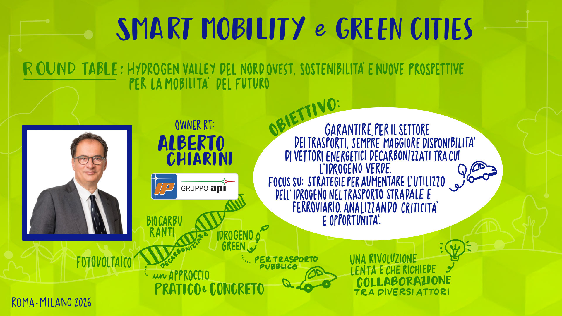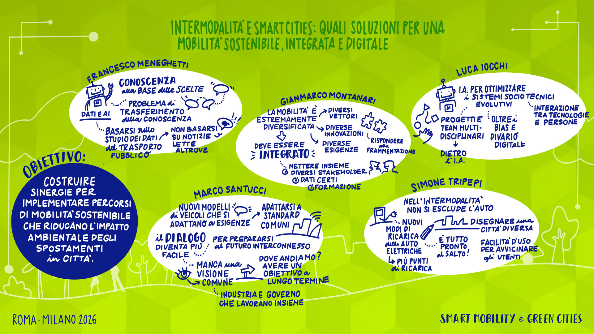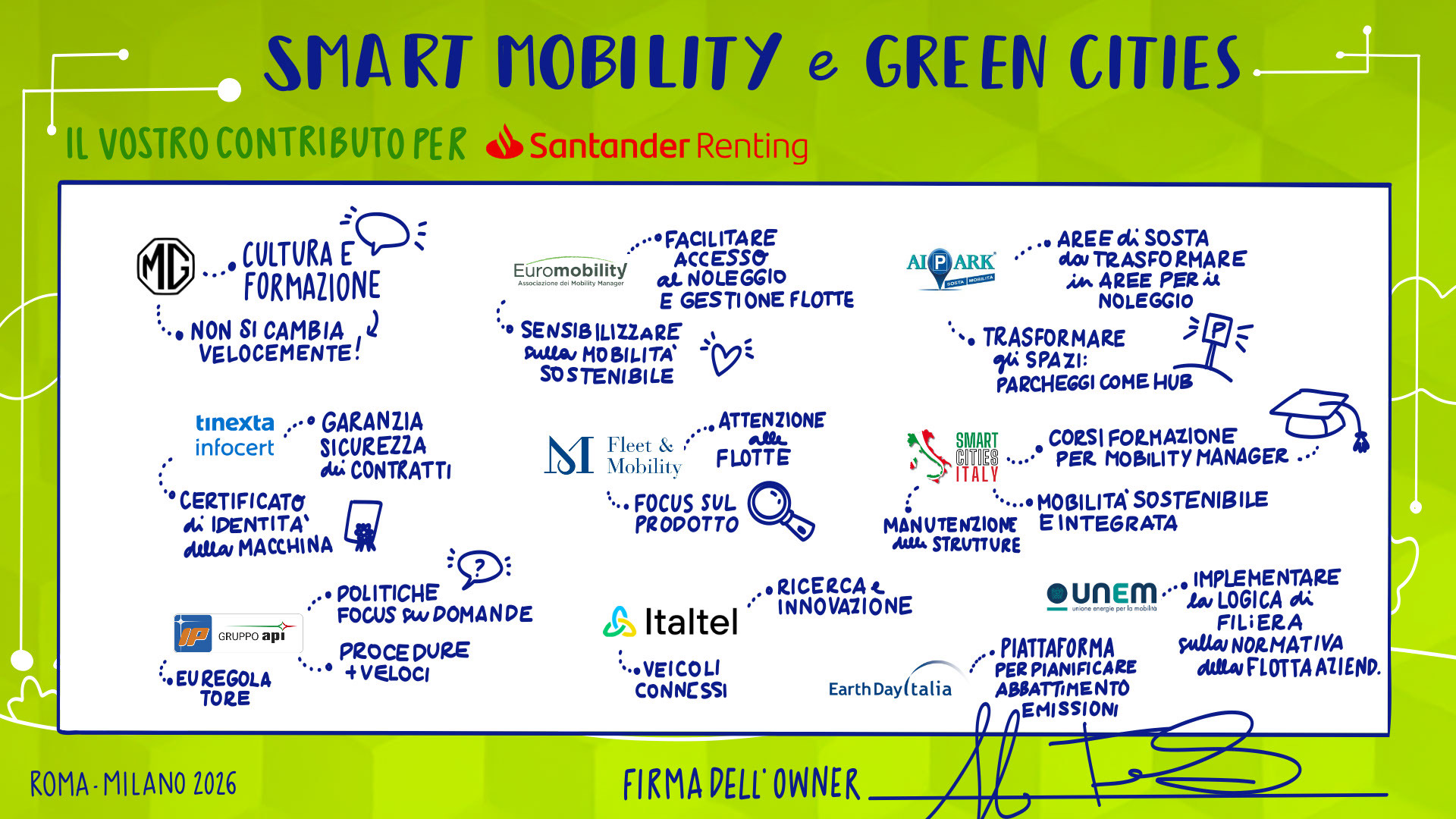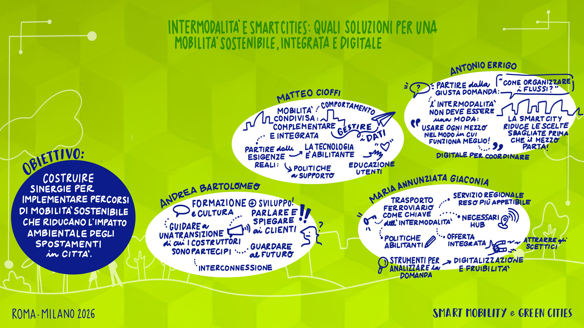 Leandro Aglieri, Presidente, Consulta Roma Smart City Lab | Mario Alovisi, CMO & Revenue Manager, Trenitalia; CEO, Italia Loyalty | Enrico Atanasio, General Manager, DR Automobiles Groupe; Brand Director, EVO | Francesco Baldoni, Direttore Generale per gli Affari Generali e la Digitalizzazione, Ministero delle Infrastrutture e dei Trasporti | Andrea Bartolomeo, Country Manager, MG Motor Italia | Sabina Baruffaldi, Responsabile Anticorruzione, Trasparenza, Compliance e Antiriciclaggio, INVIMIT SGR S.p.A. | Federico Bartolini, Head of Testing and Finishing GT Cars, Ferrari | Matteo Beccuti, CEO, Environment Park | Giuseppe Benincasa, Direttore Generale, ANIASA – Associazione Nazionale Industria dell’Autonoleggio, della Sharing Mobility e dell’Automotive Digital | Andrea Benso, Coordinatore Tavolo Mobilità, Consulta Roma Smart City Lab | Lorenzo Bertuccio, Presidente, Euromobility | Federico Bullo, VP Global Portfolio Strategy Construction Equipment, CNH | Davide Buscato, Co-Founder, Busforfun.com e Parkforfun.com | Andrea Carbutti, Direttore Generale, Agos Renting | Paola Carrea, Direttore Generale, UnipolTech | Andrea Cardinali, Direttore Generale, UNRAE | Alessandro Cattaneo, Componente Commissione Trasporti, Poste e Telecomunicazioni, Camera dei Deputati | Luciano Cantone, Segretario IX Commissione (Trasporti, Poste e Telecomunicazioni), Camera dei Deputati | Andrea Caroppo, Vicepresidente Commissione Trasporti, Poste e Telecomunicazioni, Camera dei Deputati | Andrea Casu, Vicepresidente Commissione Trasporti, Poste e Telecomunicazioni, Camera dei Deputati | Alberto Chiarini, CEO, IP Gruppo api | Matteo Cioffi, Regional Director Central Europe, Lime | Valerio Cocco, Head of Global Services, Italgas | Mattia Comelli, Head of FVL Business Development Italy, CEVA Logistics | Alessandro Corsini, Professore Ordinario di Sistemi per l’Energia e l’Ambiente, Università Sapienza di Roma | Stefania Crotta, Direttore Generale Direzione Programmi e Incentivi Finanziari, Ministero dell’Ambiente e della Sicurezza Energetica | Pasquale Cuzzola, CEO, IPlanet | Cesare D’Angelo, General Manager Italy, France & Mediterranean, Kaspersky | Rolando D’Arco, CEO, LEASYS Group | Ivana D’Errico, Public Sector Lead, Google Cloud | Giovanni Dattoli, Managing Director, Volvo Trucks Italia | Salvatore Deidda, Presidente, IX Commissione Trasporti, Poste e Telecomunicazioni, Camera dei Deputati | Francisco Ditano, Head of Industry, Hilti Southern Europe | Luigi D’Onofrio, Consigliere, H2IT | Antonio Errigo, Vicedirettore Generale, Associazione Logistica dell’Intermodalità Sostenibile | Valeria Falce, Ordinario di Diritto dell’Economia, Jean Monnet Professor, Digital Transformation | Antonio Falvo, Responsabile Area Trasformazione Digitale e Innovazione, Roma Servizi Mobilità | Giorgio Fanesi, CEO, MyCicero | Massimo Fedeli, Direttore Metodi e Tecnologie, ISTAT | Francesco Ferrante, Vicepresidente, Kyoto Club e Coordinamento FREE | Stefano Firpo, Direttore Generale, Assonime | Giulio Foldes, CEO, Santander Renting | Roberto Forte, Chief Commercial Officer, Unidata | Raffaele Fusilli, CEO, Renault Italia | Stefano Gargiulo, Managing Director, Europcar Mobility Group Italy | Maria Annunziata Giaconia, Responsabile Direzione Operations Regionale, Trenitalia | Andrea Gianni, Responsabile Asset Facility & Energy Management, Cotral | Stefania Gilli, Director, Vodafone IoT Italy | Flavio Ghiringhelli, Country Manager Italia, Emirates | Marco Girelli, CEO, Alphabet Italia | Marco Gioieni, Amministratore Delegato, Allianz Partners Italia | Giovanna Menzaghi, Presidente, Smart Cities Italy | Federico Lagni, CEO, Enerev | Giovanni Lipari, CEO, Lipari Consulting | Giovanni Lorino, Managing Director, KONE | Aldo Longana, CEO, GreenForce | Paolo Manfreddi, CEO, Drivalia Group | Simone Mantero, CEO, Knorr-Bremse Rail Systems Italia | Gianmarco Montanari, Direttore Generale, Centro Nazionale per la Mobilità Sostenibile | Laura Morgagni, Segretario Generale, Cluster Nazionale SmartCommunitiesTech | Giorgio Mulè, Vicepresidente, Camera dei Deputati | Angelo Mautone, Direttore TPL, Ministero delle Infrastrutture e dei Trasporti | Giordano Fatali, Presidente & Founder, CEOforLIFE | Mario Nobile, Direttore Generale, Agenzia per l’Italia Digitale | Giuseppe Pezzetto, Presidente, 5T | Fabio Pressi, CEO, A2A E-Mobility | Toni Purcaro, Head of Region Central East Europe & Middle East – Executive VP, DEKRA Group | Carmine Fabio Raimondo, Componente Commissione Trasporti, Poste e Telecomunicazioni, Camera dei Deputati | Pier Antonio Rossetti, Presidente, FERROVIENORD S.p.A. | Federica Saccani, Head of Building Consultancy P&DS, JLL | Marco Santucci, Managing Director, Geely Italia | Cesare Sironi, CEO, A2A Smart City | Gianluca Soma, Practice Leader Mobilità Sostenibile e Smart Cities, Task Force Italia | Stefano Stoppani, Country Manager, Visa | Michelangelo Suigo, External Relations, Communication & Sustainability Director, INWIT | Davide Tassi, Head of Sustainability, ENAV | Concetta Testa, Responsabile Sustainability, Autostrade per l’Italia | Pietro Teofilatto, Direttore Area Fisco ed Economia, ANIASA | Simone Tripepi, Head of Charging Point Operator Italia, Enel | Elisa Weltert, General Manager South Europe, Maserati | Giovanni Zannola, Consigliere Assemblea Capitolina e Presidente III Commissione Mobilità, Roma Capitale